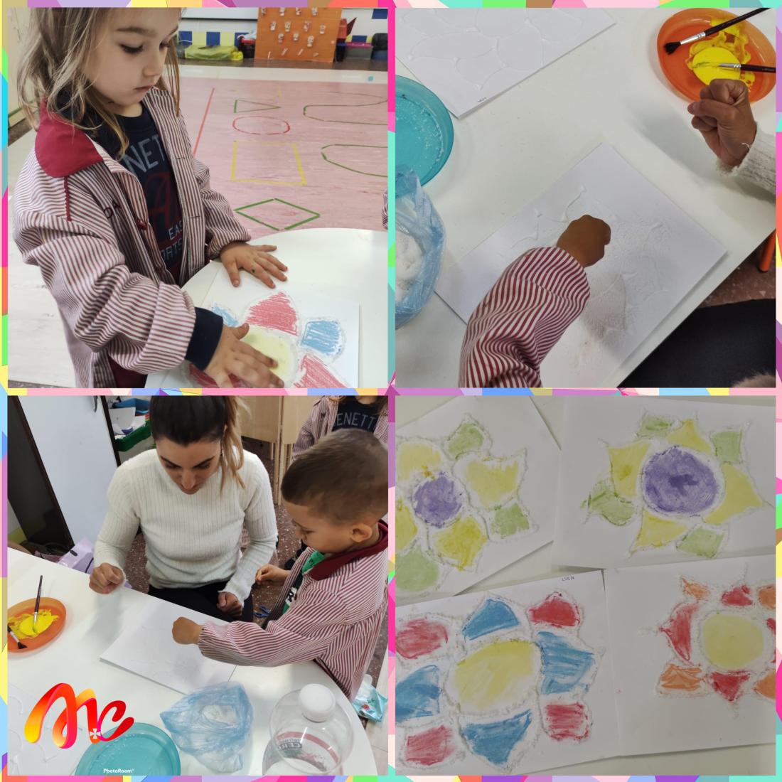3 urteko geletan pegamentu, gatza eta klarionekin izugarrizko loreak margotu ditugu.